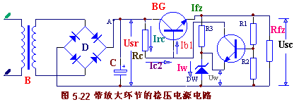 Usrmin 为整流输出的最小电压。Ic2可取1~3毫安。稳压管DW的稳定电压Uw,选择范围比较宽,只要不使BG2 饱和(即Uw比Usc 低2伏以下)均可。Uw取得大,取样电压可大些,有利于提高稳压性能。限流电阻R3通过的电流I3,应该等于DW的稳定电流,那应满足下述关系: