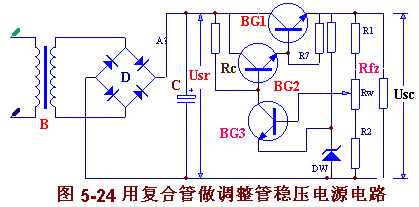 用复合管做调整管时,BG2 的反向电流Iceo2将被放大,尤其是采用大功率锗管时,反向截止电流Icbo比较大,并随温度增高按指数增加,很容易造成高温空载时稳压电源的失控,使输出电压Usc 增大。误差信号ΔUsc 经放大加到BG2 的级基极来减少Ic人,可能迫使BG2 截止。为了使调整管在不同温度下都工作在放大区,常在BG1 的基极加电阻(R7)接到电源的正极(如图5一24)或负极。在温度或负载变化不大或全用硅管时,可不加这个电阻。