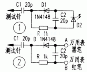 如把它安装在一只万用表的测试笔杆内,只要把笔针靠近手持对讲机发射天线的顶端,即可从发光二极管D2的发亮与否,准确地判断对讲机有没有功率发射,且可根据发光二极管的光暗程度,粗略判断发射功率的大小,制作费用不超过一元。