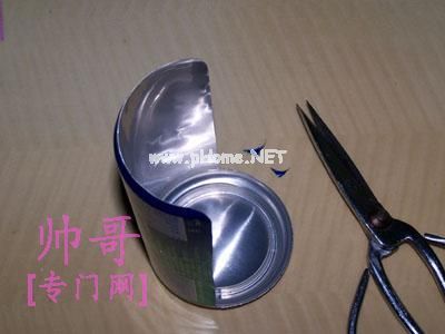 首先把易拉罐清洗干净,把里面的水倒掉。然后用美工刀沿着易拉罐接缝的地方慢慢切开,如图: