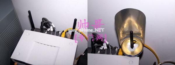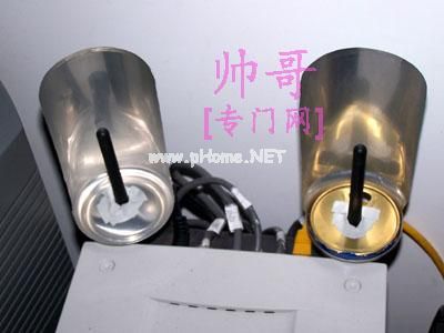 将贴好的半个罐子套到原来的AP天线上试一下松紧程度,大约以能够套进天线而且保持一定的固定能力为准。如果太松的话就再贴一些胶带上去。再试一下旋转这半个罐子,要做到能够旋转自如。象下面相片中就是合适的松紧程度:(左边的图是原来的AP样子)