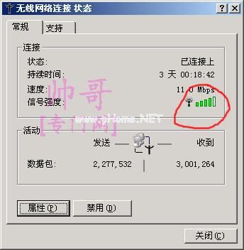 这个是原来隔了三堵墙后,帅哥的802.11a/b/g网卡接收到的TPlink ap信号强度。这个时候虽然还显示连接速度为11M,但实际上只能以非常慢的速度访问网页,要想点播局域网内另一台电脑上的DVDRip电影是绝对播不出来的。