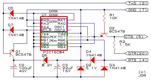 JDM PIC 编程器最初的设计是一个奇特的创新,它非常灵活地运用了三极管及串口的工作原理,在无外部电源供应的情况下实现了VDD+5V、VPP+ 13V电源供应和时钟、数据的收发。而且串口的使用也不拘泥于其端口引脚的原定义,令人不得不佩服设计者的智慧。当初原设计时作者应该写了一个DOS下的驱动,而后来IC-PROG对其的支持使其在WINDOWS下面发扬光大。鉴于现在JDM被推荐和受欢迎的程度,我们实在应该感谢Jens Dyekjar Madsen创造了JDM,而Bonny Gijzen对它的支持则使其发扬光大。