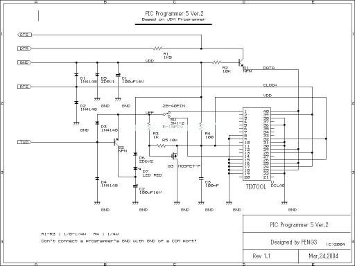 图二是日本一个火腿族FENG3的改良版,最初的改良是为了使其可以用同一个卡座烧写40PIN及以下的直插式MCU,并且加了一个LED指示烧写状态。其后又增加了Q3,为的是在VPP在VDD之前加到MCU上,我在他的网站上没有找到关于为何要“VPP Befor VDD”的理由,但我猜想是为了一些有内部RC振荡的MCU所设计,因为如果使用有内部振荡的MCU而又选择了这个功能,在多次重复烧写时可能出现问题。试想如果MCU原来烧有程序,在VDD上电的同时MCU开始运作,由于有许多脚接地,在MCU初始化端口后就会导致某些设置成输出脚对地短路而烧坏 MCU。但是这里实现这个功能时有个问题,这将在其后说明。