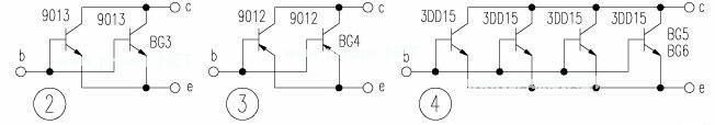 本电路中元器件均为易购的常用元器件,按图中所示数值选用即可。B1用收音机输出变压器,应选用铁心大,线径粗的那一类,把原来接喇叭的这一组线圈接在L2位置,BG3、BG4分别用两只9013和9012并联组成,如图2和图3所示。BG5、 BG6均由四只3DD15并联组成,如图4所示。BG5、 BG6的散热器面积不应小于600cm2,B2逆变变压器可选用成品。整机用印刷线路板可自行设计制作。电瓶选用容量大于150Ah的电瓶。