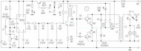 电路见图1。当把开关K1打向“逆变”位置时,BG1导通,由时基电路NE555及外围元件组成的无稳态多谐振荡器开始振荡,其充、放电时间常数可调节。如果选择R1=R2,则输出脉冲的占空比为50%,该多谐振荡器的振荡频率f=1.443/(R1+R2+2W)C2,图中的元件数值可使振荡频率调在50Hz,振荡脉冲由役脚输出,波形为方波,该方波经C4耦合,R3、C5积分变为三角波,这个三角波又经R4、C6,第二次积分和R5、C7第三次积分,变为近似的正弦波,通过C8耦合到BG2,由BG2放大后在B1的L2线圈上输出。当L2上端电压为正时,D4截止,D3导通,使BG4、BG6截止,BG3、BG5导通,电流由电瓶正极→B2的L1→BG5→电瓶负极;当L2上端电压为负时,D3截止,D4导通,使BG3、BG5截止,BG4、BG6导通,电流由电瓶正极→B2的L2→BG6→电瓶负极。BG5、BG6交替导通、截止,经变压器B2合成正负对称的正弦波,并由L3升压送至逆变输出插座CZ1、CZ2,供用电器使用,同时LED1(红色)亮,指示逆变状态。