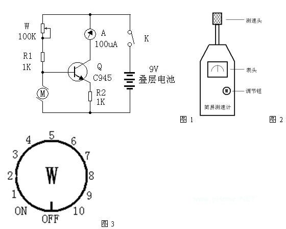 制作时,按图1所示选择元器件即可,其中M为微型玩具直流电动机;A选用100uA的表头,最好指针在表盘中间位置,这样测速时,就不受被测物体旋转方向的限制,否则测试方向错误时,表针会反偏,损坏表头;W可选用带电源开关的线性电位器,这样便于在面板上划出均匀的测试档位刻度线;电源可选择9V叠层电池。电路简单不需要制作印路板,采用搭焊即可,焊好后将整个装置在一个适当的小盒子里,外观见图2。测速头采用一个柔性的橡胶连接头如录音机的压带轮,紧套在电机轴上。