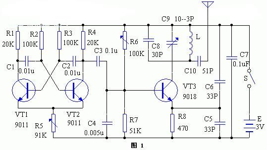 该装置是由发射机和接收机两部分组成的系统,工作于调频(FM)波段。发射机的电路工作原理见图1。它是由三极管VT1、VT2及其外围元件构成的多谐振荡器,其工作频率约为1000Hz,其信号通过电容器C3取出去调制由VT3及其LC元件构成的调频振荡器,被调制的调频信号从 C10输出,通过机内微型天线向空间辐射。其中C6的作用是加宽频带并能有效防止人体感应对频率的影响。
