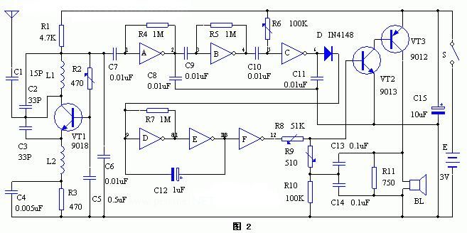 接收机的电路工作原理见图2。由三极管VT1及其LC元件等组成超再生接收电路,用来接收发射机发出的调频信号。门电路A、B、C构成信号放大电路,将接收到的信号放大、比较、倒相去控制门电路D、E组成的1Hz振荡电路,再由门电路F倒相输出去控制由三极管VT2、VT3组成的互补音频振荡器。