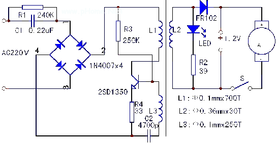 50Hz的交流电下0.22μ/400V的电容容抗约为14.5K,因此即使是输出端短路,电路最大的电流也只有15mA。2SD1350和脉冲变压器T组成直流变换器,以降低电压,同时达到提高次级电流的目的。如果2SD1350集电极平均电流为10mA,则加到集电极的电压约为38V,可输出0.38W的功率,次级最大电流可达到230mA,以满足充电的要求。