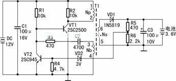 在VT1截止时,直流供电输人电压和Nb感应的3负4正的电压又经R1、R3给C2反向充电,逐渐提高VT1基极电位,使其重新导通,再次翻转达到饱和状态,电路就这样重复振荡下去。