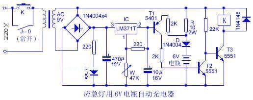 市面上出现的6V电瓶供电的应急灯,随机配的充电器过于简单,长时间工作发热严重、易烧毁。充电时还容易造成电瓶过充,引起电解液过早干涸而缩短电瓶寿命。针对这一缺点,笔者将其改成自动充电器,经半年多使用,效果良好,电路如下图所示:
