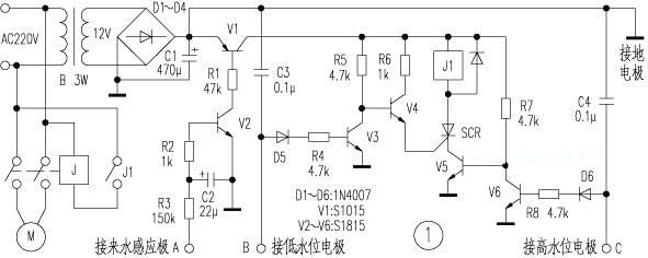 电路原理如图1所示,由于水路本身就是一个良好的接地体,因此本电路把水路和地阻作为三极管V2、V3、V6偏置电路的一部分。将电源正极接地后,各电极只需一根导线即可完成对有关三极管的触发,工作原理读者不难自行分析。图中C3、C4为抗干扰电容,防止电极b、c的引线从控制器向屋顶水箱的走线过程中,与照明电网的相线并行而感应出电流进入V3、V6基极,使电路无法正常工作。本电路只要参照电路图选择合格元件,并正确安装即可使用。图中J1是小型继电器,J是交流接触器。