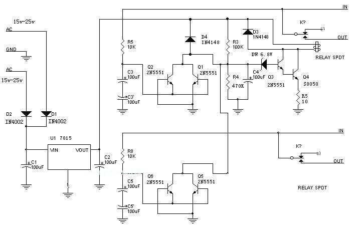 三端稳压器的输入电容,是根据负载而定的,如果采用的是直流电阻很小的大功率继电器,因该用470UF以上的电容,由于本继电器的电阻比较大,实测为:1K左右,就是说本电路的消耗电流应该在20MA以下,实验中采用47UF的电容可以正常工作,电路中用100UF的电容是可行的,如果此电容过大,会使关机时不能即使切断负载与放大器的连接,对耳机造成冲击。由于本电路的工作电流很小要是把三端稳压电路换成78M15或者78L15都是可以的。
