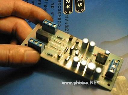 整整3个小时的时间,终于把耳放的保护电路焊好了,由于元件不凑手,参数与上面的原理图有出入,可喜的是一次焊接成功,注意输入输出接线端子之间的小黑色长方体就是那个小日本的微型继电器,用来保护耳机是最合适的了,当然,你也可以采用大型的继电器,把她用做喇叭保护,PCB板子上已经按照双继电器的安装形式制作。