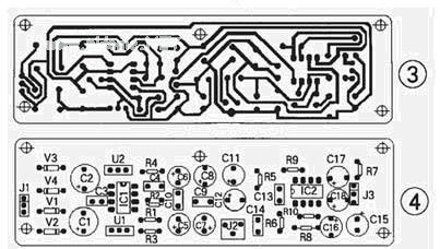 图3为印刷电路板图,图4为元件布置图。具体安装时,可将此电路板安装在功放箱中靠近背面的附近。通孔,并经过J2(双信号插座)接音源。