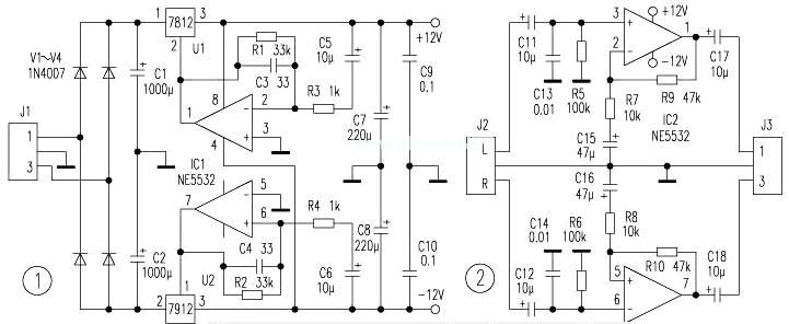 图1为前放电路的直流伺服电源电路,给前放电路提供稳定的±12V电源。稳压电路采用三端集成稳压块,并且使用一片NE5532构成伺服电路,实现对输出电压的实时跟踪与调整。图2为前置放大电路,电路采用了“运放之星”NE5532构成同相比例运算放大电路,其放大倍数为5倍左右(主要由R9、R7、R10、R8决定),C15、C16在电路中具有提升高音频信号的作用。J1接环变的双12V输出端,J2为信号输入端,J3为信号输出端(接功放输入端)。