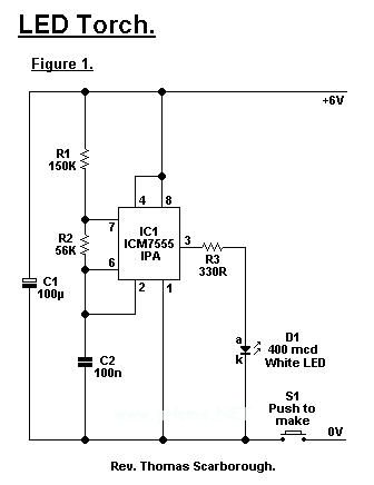 LED手电筒的核心是一个7555时基集成电路(不能使用普通的555)。一个白色的发光二极管(如果你找不到,只能用别的颜色代替)工作时发出的亮度大约为400mcd,这样当聚焦时,可照亮30米远的物体。