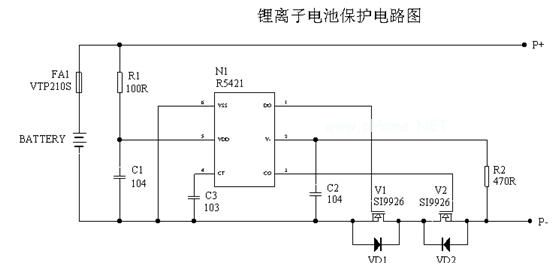 以上详细阐述了单节锂离子电池保护电路的工作原理,多节串联锂离子电池的保护原理与之类似,在此不再赘述,上面电路中所用的控制IC 为日本理光公司的R5421 系列,在实际的电池保护电路中,还有许多其它类型的控制IC,如日本精工的S-8241系列、日本MITSUMI的MM3061系列、台湾富晶的FS312 和FS313 系列、台湾类比科技的AAT8632 系列等等,其工作原理大同小异,只是在具体参数上有所差别,有些控制IC 为了节省外围电路,将滤波电容和延时电容做到了芯片内部,其外围电路可以很少,如日本精工的S-8241 系列。