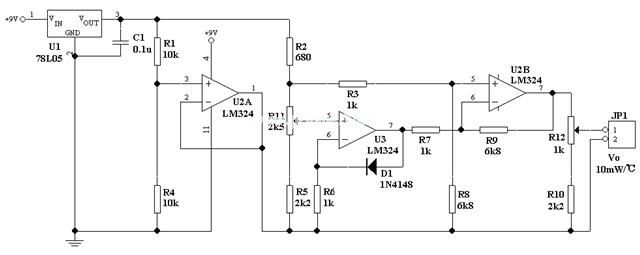 如上图所示,一个恒定的参考电压加在运放A2的同相输入端,运放的反相输入端则接入一个二极管和一个电阻。流过二极管的电流同时也流过电阻,因此在电阻上保持了恒定的压降。这样当运放输出端电压发生变化时,它只可能是因温度变化而造成二极管正向压降变化所致,即运放输出电压的变化正比于二极管的温度变化。图中的参考电压由集成稳压器IC提供。IC1的输出电压经过R3、W1、R4组成的分压器分压后加到A2上。A2的输出电压再经过A3放大。A3的同相输入端也保持恒定的电平,其电压也是由R3和W1、R4分压后提供的。R5和R8阻值的选择应使0V对应于环境温度0 度。