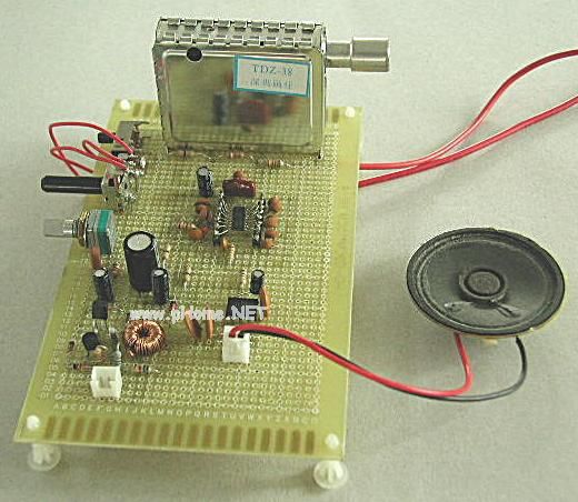 工作原理:由高频头将天线接收到的微弱调频信号进行放大和混频,混频后产生的31.5MHz伴音中频信号由IF端输出。ICl为调频接收集成块(由于高频头具有良好的调谐接收性能,而TDA7010T是专用调频接收1C,接收灵敏度达3uV,从而保证了整机具有很高的接收灵敏度),中频信号输入ICl的(11)脚,经ICl进行中频放大、调频检波后由②脚输出音频信号,IC2用于音频信号功率放大。T1、T2及LEDI等组成调谐指示电路。