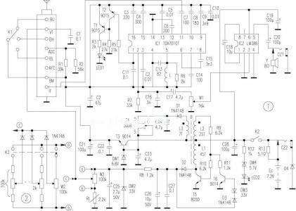 T3、DWI、T4及相关元件组成6V稳压电路,为高频头及ICl提供稳定工作电压。T5、T6、B及相关元件组成升压逆变电路,通过T6、D3、DW3 检测输出电压,以控制T5的振荡强度,达到稳压节能的目的。逆变电路输出33V调谐电压,供高频头调谐选台之用。Rt为温度补偿电阻,用于补偿开机初始因电容初充电造成33V调谐电压轻微不足(极轻微,用万用表测量不出)。图2为预选台电路,与K1配合使用。元件选择与制作:高频头可选用TDQ-3型470MHz全增补高频头,AFC脚留空,R1、R2、Cl选用微型或贴片元件,可直接焊接在高频头屏蔽盒内。调谐电位器W2选用100k多圈电位器,使调谐选台更方便,更稳定。ICl外围电路宜选用贴片元件安装,L用0.4mm漆包线在3mm的圆珠笔心上密绕 23匝而成。升压逆变器B用1Omm小磁环作磁心(可从旧电子镇流器上拆用),用透明胶布包一层作绝缘处理,用0.25mm漆包线绕制,数据见图1上标注的数值。L3的作用是为6V稳压电路提供比电源电压略高(约0.8V)的偏置电压,以保证当电池电压下降至6.2V时仍有6V稳定电压输出。T4作恒流管用,DWI提供稳定的偏置电流。由于电源供电电路采取了相应措施,使6V输出电压和33V调谐电压非常稳定,保证了高频头和中放鉴频电路的高稳定性。电源选用6节7号镍氢充电电池或两块锂充电电池,CZ2为外接电源插孔。喇叭选用中50mm内磁式,整机可安装在14. 5cmx8cmx2.2cm的塑料盒内。调试本接收机唯一需要调试的就是ICl的接收频率。为了保证其调谐为31.5MHz,可用正常接收的电视机配合调试:即用导线连接电视机高顿头IF端与 TDA70IOT的天线输入端(即(11)脚),并连接地线;调整L,使之能收到伴音信号即可。测升压逆变电路工作电流约12mA;整机静态电流应小于 45mA;电源电压在6.2~9V之间变化时,整机电流基本不变。使用效果本接收机经笔者半年多的使用和检验,效果令人非常满意。接收灵敏度很高(接收当地调频广播和电视台信号只需几厘米长的天线即可),工作稳定可靠;功耗低,小巧玲珑,令人爱不释手。由于高频头采取了低电压供电方式,使其工作电流大为下降。因此整机工作电流很小,从而利于用电池供电。本接收机的不足之处是开机初始需经过约3秒钟时间才能进入稳定工作状态。