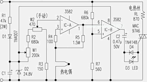 该电烙铁控温范围是100℃~400℃,调温标志标明低、中、高位,控温精度标称±5%,采用了热电偶传感器。控制电路采用了交流市电直接降压、滤波、稳压供电方案。工作原理见下图。市电AC220V经R1降压、D1半波整流、D2削波稳压、C1滤波后作为比较器件IC的电源电压及调温设定电压源。IC-A③脚为热电偶检测电压输入端(与温度值对应);②脚为调温设定电压。在②、③脚两端电压比较后,由①脚输出。其中R5的作用是将输入的很少一部分反馈至同相输入端③脚,以使在小信号波动时输出锁定不变。当热电偶检到温度偏低时;③脚电平相对②脚低,使输出①脚也低。进而使IC-B放大器⑥脚相对于固定偏置的⑤脚偏低,使输出⑦脚为高。由于IC-B⑤脚电压是由AC220V经R6、R7分压而得,因而,频率、相位完全与AC220V相同。与⑥脚直流比较后在⑦脚输出交流电压。该交流电压经C2、D4、D3和D4反向并联(作用同双向二极管)触发双向可控硅,使相应的电压加到烙铁电热丝上,以达到恒温的目的。