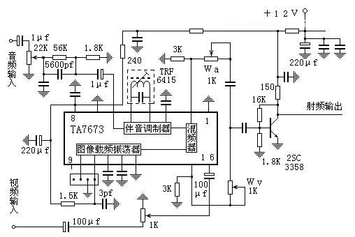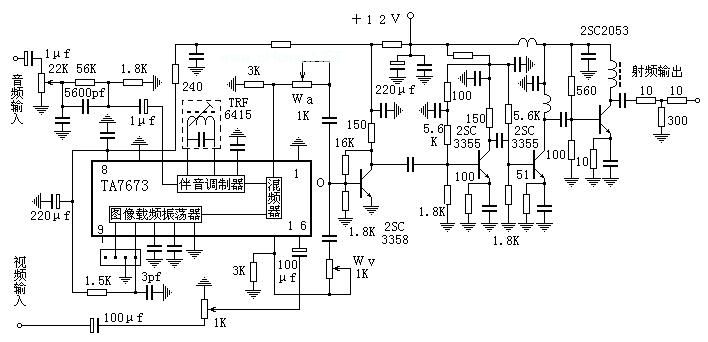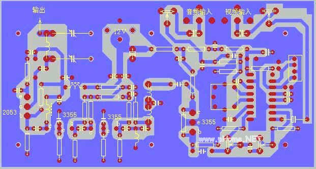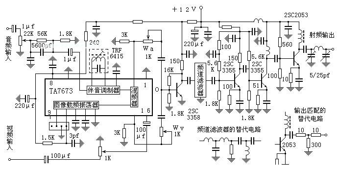 射频功放与发射天线的连接也是业余爱好者比较头痛的问题。假如天线是一个实实在在的纯电阻,当然就比较简单了,接上就行。但是天线的阻抗很不那么简单,理论上完全匹配的时候可将发射天线按纯电阻来分析,但是实践中欲令发射天线等效于纯电阻很难,在业余条件下简直就是不可能的。因此,实践中也用三个电阻组成一个3分贝衰减器来强制匹配,效果很好,很稳定,当然,它要消耗掉一半输出功率。其实,在1-5频道消耗掉一半功率也没什么,2SC2053在这个频段的射频输出功率不较大,有几百毫瓦,损失掉一半也还有一二百毫瓦,够用的。况且,若是这一匹配网络调不好,还不如3分贝衰减器呢!至于在6-12频道嘛,匹配比较容易,有时馈线通过隔直电容直连2053的集电极也能稳定工作。工作不好时再用电阻隔离也不迟。
