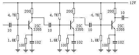对12频道的放大量是可以满足要求了,但是也不会超过50分贝。可是这个三级放大器对10MHz的放大量高达150分贝以上,这是无论如何也不能工作的。一个不能工作的放大器,你还能获得所需的增益吗?因此,多级射频放大器要设法遏制其对较低频率的放大量,较简单的方法是将电路参数按下图设置。