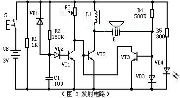 VT2和VT3构成直接耦合正反馈振荡电路,B为40KHz超声发射器件,并兼振荡电路反馈先频元件。因此,此电路可准确地振荡于超声发射器件的中心频率40KHZ。VT1和R2、C1组成500ms延时电路。R1、VD1是C1的放电通路,当按下发射键S时,VT2构成的振荡电路工作,发出超声波,同时,电源通过R2向C1充电,当C1上的电位充到1.4V时(约经过500ms),VT1导通,VT2基极以及VT3集电极电位下降为0.3V左右,振荡器停止工作,当松开发射键S时,C1通过VD1和R1迅速放电,为下一次发射作好准备.VD3和R4构成发射指示电路,当按发射键时,VD3发光。