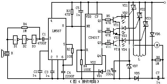 (图4)为接收电路。CMOS非门D1~ D3由R1偏置为线性放大器,总增益可达60bB以上,由于CMOS电路的输入阻抗较高,故能够很好与超声接收器件匹配。放大后的信号由C1耦合给锁相环译码器LM567的输入端3脚。当输入信号的频率落在其中心频率上时,LM567的逻辑输出端8脚由高电平变为低电平。