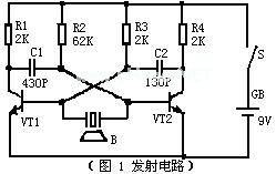 为发射电路。电路采用分立器件构成,VT1和VT2以及R1~ R4、C1、C2构成自激多谐振荡器,超声发射器件B被联接在VT1和VT2的集电极回路中,以推挽形式工作,回路时间常由R1、C1和R4、C2确定。超声发射器件B的共振频率使多谐振荡电路触发。因此,本电路可工作在最佳频率上。