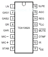 TEA1062是飞利蒲公司生产的专用电话集成电路,为双极型,片内包含通话所需的全部电路及拨号接口电路,最低工作电压为1.6V。管脚排列如下: