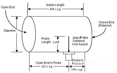 We chose to build the antenna for 2.442GHz, or channel 7, as this is close to the center of the 13 channels available to us (US designs use channel 6 (2.437Ghz), as they have 11 channels). I have included a key lengths calculator in the form below. Nb.Rectangular waveguides use a different formulae (see Rectangular Waveguide).