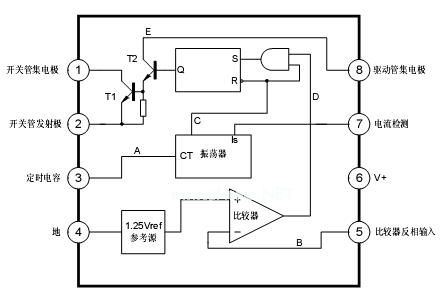 振荡器通过恒流源对外接在CT管脚(3脚)上的定时电容不断的充电和放电,以产生振荡波形。充电和放电电流都是恒定的,所以振荡频率仅取决于外接定时电容的容量。与门的C输入端在振荡器对外充电时为高电平,D输入端在比较器的输入电平低于阈值电平时为高电平。当C和D输入端都变成高电平时,触发器被置为高电平,输出开关管导通,反之,当振荡器在放电期间,C输入端为低电平,触发器被复位,使得输出开关管处于关闭状态。
