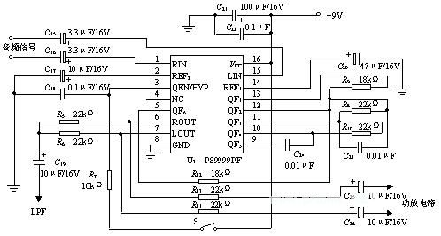 虚拟环绕声处理电路采用PS9999芯片,该芯片利用Qsound实验室开发并专有的QsurroundTM技术,是可对经过杜比环绕声编码或者其它矩阵编码的立体声声源进行解码并虚拟两声道输出的音频处理器,能对输入信号进行自动识别处理。PS9999芯片主要特点如下: