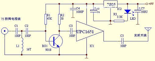 电路如图下图所示: 这个电路的工作原理是射频信号经75欧姆射频电缆送至有C1、 L1、C2 构成的高通滤波器,将低于45MHZ的频率滤除,然后在经三极管9018等组成的前置放大器放大后由电容C3送至upc1651进行功率放大,其输出信号经6英吋左右的鞭状天线发射出去。7805等构成稳压与电源指示为upc1615提供5V的供电。