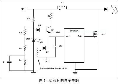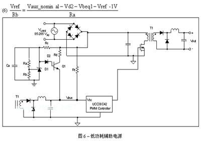 通过电阻器Rd的Ra以及二极管D1、D2,再加上晶体管Q1,它们构成了低功耗偏置电源。低功耗偏置电源根据设置可调节电压,使其高于PWM 的关闭电压,又低于辅助绕组的额定电压(Vaux_nominal)。这就使晶体管Q1能作为二极管或电路发挥作用。如果PWM由辅助绕组供电,那么 Vaux电压将反向偏置,关闭晶体管Q1而节约能量。如果由于能量不足Vaux电压下降,那么Q1就会变成正向偏置,以向PWM控制器提供必需的能量。