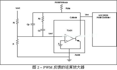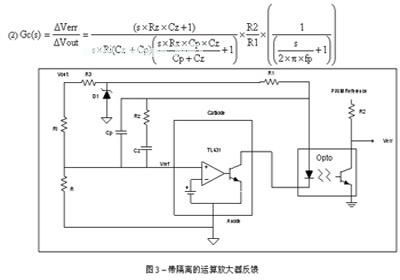 在设计包含PWM而不含电压放大器的电源设计时,系统设计人员可采用并联稳压器作为廉价的运算放大器。图2给出了这种应用的功能结构图。方程式1解释了这种补偿网络的小信号传输函数的数学原理。