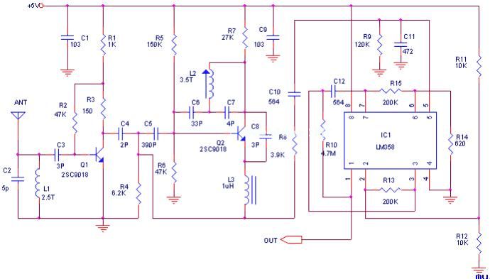 接收机可使用超再生电路或超外差电路,超再生电路成本低,功耗小可达100uA左右,调整良好的超再生电路灵敏度和一级高放、一级振荡、一级混频以及两级中放的超外差接收机差不多。然而,超再生电路的工作稳定性比较差,选择性差,从而降低了抗干扰能力。下图为典型的超再生接收电路。