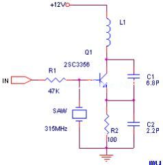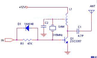 早期的发射机较多使用LC振荡器,频率漂移较为严重。声表器件的出现解决了这一问题,其频率稳定性与晶振大体相同,而其基频可达几百兆甚至上千兆赫兹。无需倍频,与晶振相比电路极其简单。以下两个电路为常见的发射机电路,由于使用了声表器件,电路工作非常稳定,即使手抓天线、声表或电路其他部位,发射频率均不会漂移。和图一相比,图二的发射功率更大一些。可达200米以上。