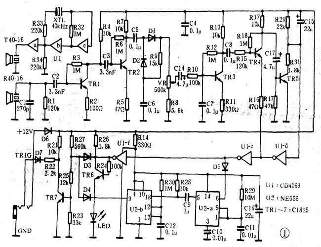 由超声接收传感器R4o-16,TRl,TR2等组成。R4o-16是配对接收器,将空间40kH~超声波转变为40KHz脉冲电压,经TRI:TR3两级线性放大器后有较大的幅度输出。