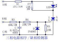 本文介绍的三相电源相序/缺相检测器,主要用来检测三相交流电源的接线是否缺相以及相序是否正确。电路原理如附图所示,图中,若A相(1)、C相(3)、 B相(2)分别连接至可控硅A、G、K极时,可控硅T将在单相半个周期内导通,发光二极管将发出正常亮光,当连接A、B、C三相的相序不正确时,可控硅T 的导通时间将会变短,平均电流随之减小,LED亮度也就大为降低。当三相交流电缺(断)其中一相或两相时,可控硅截止,LED熄灭,图中R3、R4和C的数值将决定延时时间t的长短。