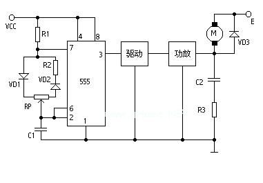 这是一个占空比可调的脉冲振荡器。电机M是用它的输出脉冲驱动的,脉冲占空比越大,电机电驱电流就越小,转速减慢;脉冲占空比越小,电机电驱电流就越大,转速加快。因此调节电位器RP的数值可以调整电机的速度。如电极电驱电流不大于200mA时,可用CB555直接驱动;如电流大于200mA,应增加驱动级和功放级。