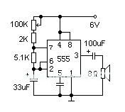 时基电路555构成一个极低频振荡器,输出一个个短的脉冲,使扬声器发出类似雨滴的声音(见附图)。扬声器采用2英寸、8欧姆小型动圈式。雨滴声的速度可以通过100K电位器来调节到合适的程度。如果在电源端增加一简单的定时开关,则可以在使用者进入梦乡后及时切断电源。