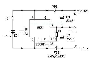 附图电路中,时基电路555接成无稳态电路,3脚输出频率为20KHz、占空比为1:1的方波。3脚为高电平时,C4被充电;低电平时,C3被充电。由于 VD1、VD2的存在,C3、C4在电路中只充电不放电,充电最大值为EC,将B端接地,在A、C两端就得到+/-EC的双电源。本电路输出电流超过 50mA。