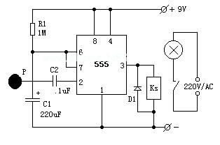 集成电路IC1是一片555定时电路,在这里接成单稳态电路。平时由于触摸片P端无感应电压,电容C1通过555第7脚放电完毕,第3脚输出为低电平,继电器KS释放,电灯不亮。