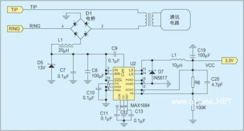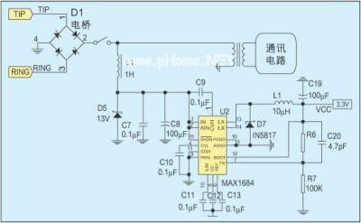 摘机馈电电路大致分为两类,馈电电路与通讯电路并联的属于并联馈电,馈电电路与通讯电路串联的属于串联馈电。图2是一种常用的并联馈电电路,大电感L1保证直流馈电不会影响交流信号。对于恶劣的线路状况,如5km长的用户线路,若不考虑通讯电路的影响,齐纳管D5上的电压最大为15V,功率可达340mW。当线路状况更加恶劣时,将齐纳管D5上的电压降低到13V,则可获得300mW左右的功率。利用MAXIM公司的开关频率为 600KHz,效率可达95%的高效DC/DC转换器MAX1685,将这个电压转换成3.3V就可获得85mA的电源电流。