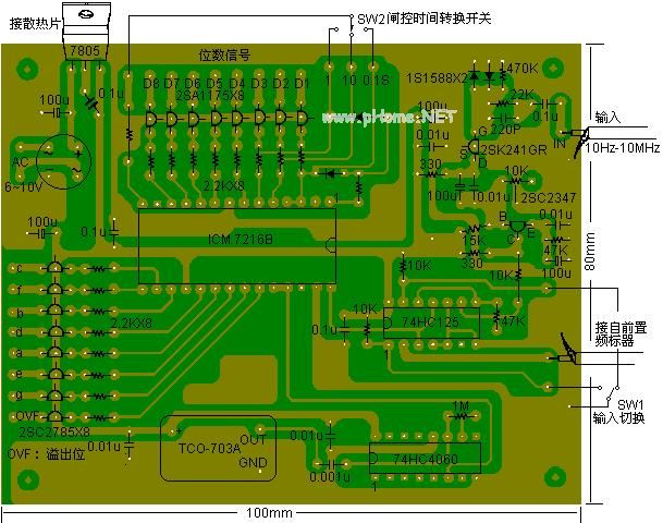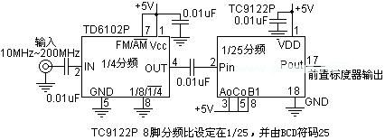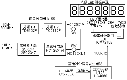 (计频器IC最大输入频率仅为10MHz,因此,利用预置分频器做1/100分频,可以扩大测试的频率范围。)