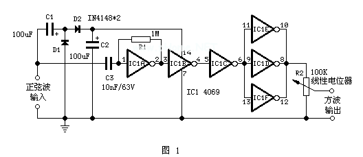 在一些电路的测试中(如音频电路),有时会对输出情况进行测试。这里介绍一个无需另外电源的正弦波变方波转换电路(见图1),它可从已有的正弦波发生器中提出良好的方波信号而不需外接电源为其电路供电,使得它可以方便的将正弦波发生器和测试装置结合在一起。